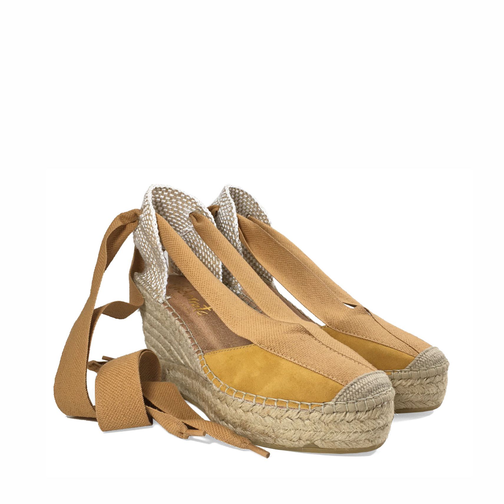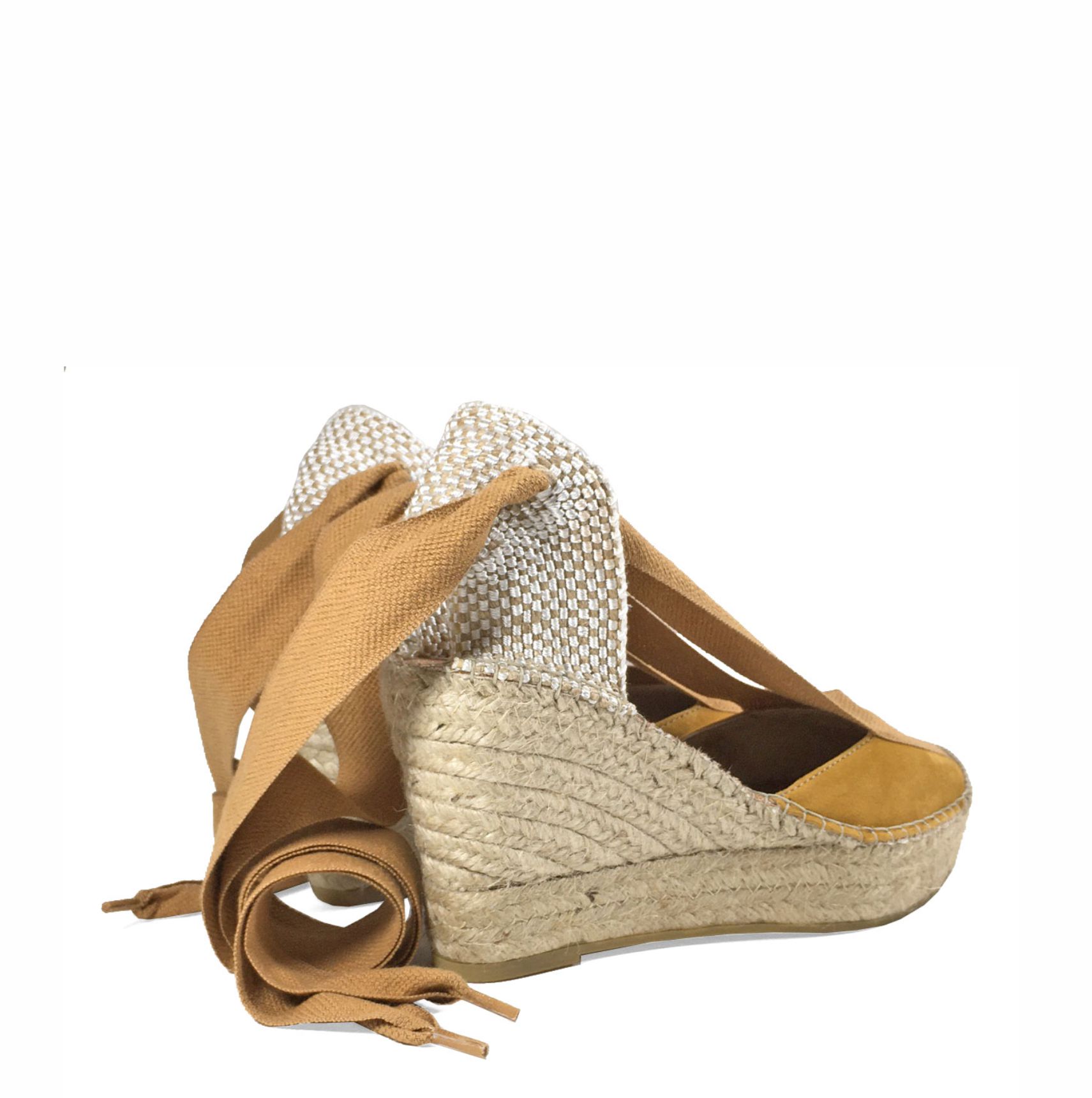 Sandalia cerrada con cuña en serraje con pasados y cintas en contraste para atar al tobillo y puntera reforzada fabricada en yute natural. La cuña mide 5,5 cm con 2 cm de plataforma. Altura total de 7,5 cm.