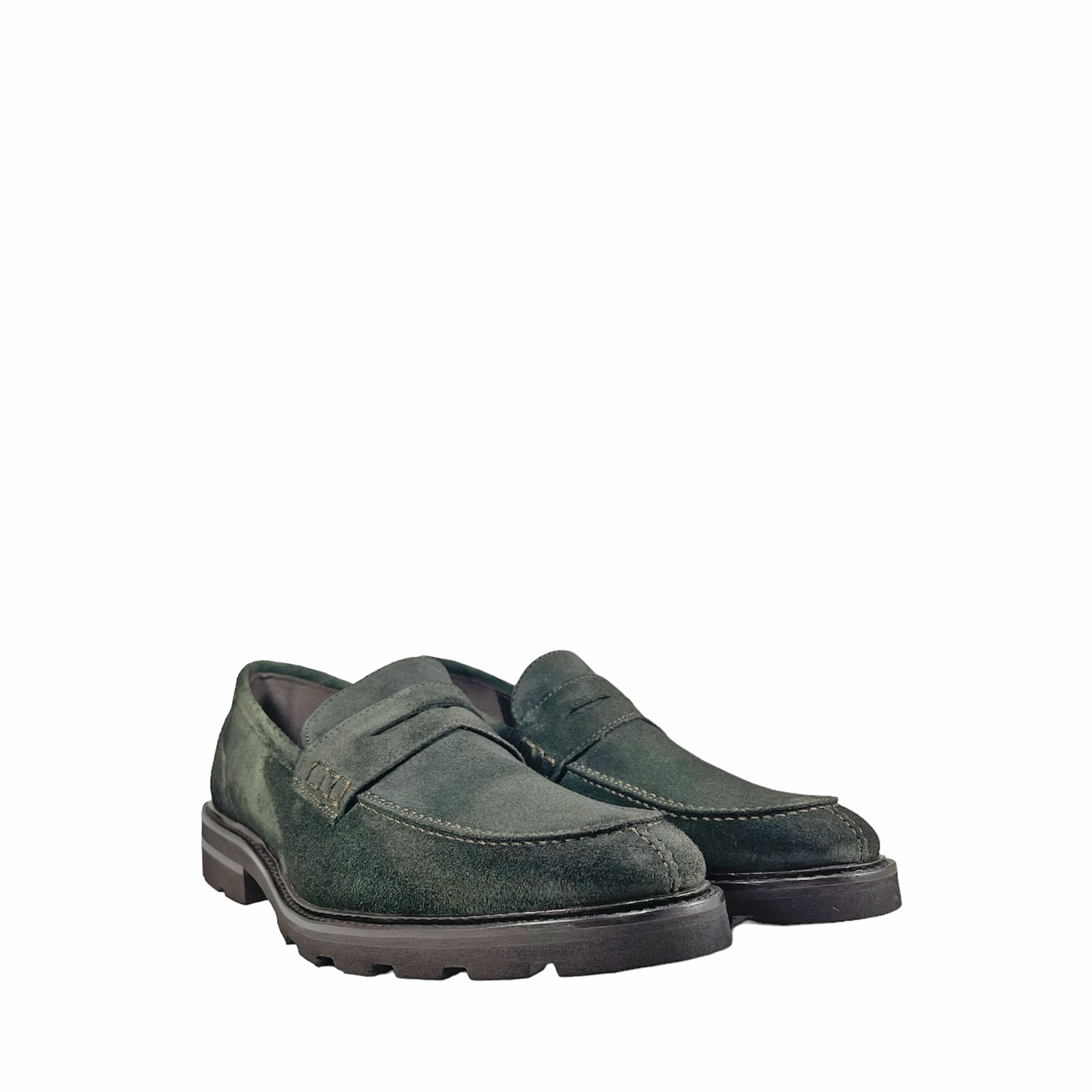 Mocasín de Michel de antifaz, suela con volumen muy confortable. Este tipo de zapatos son aptos tanto para un look de oficina como para un look mas relajado, combinados en piel serraje color verde botella para combinar con el colorido invernal.
